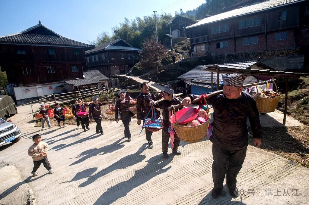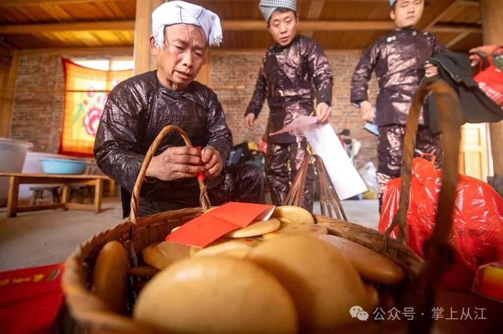 近日,在从江县丙妹镇大塘村,苗族舅舅在给该镇两料村的外甥女“送年粑”。(从江县融媒体中心记者 吴德军)。