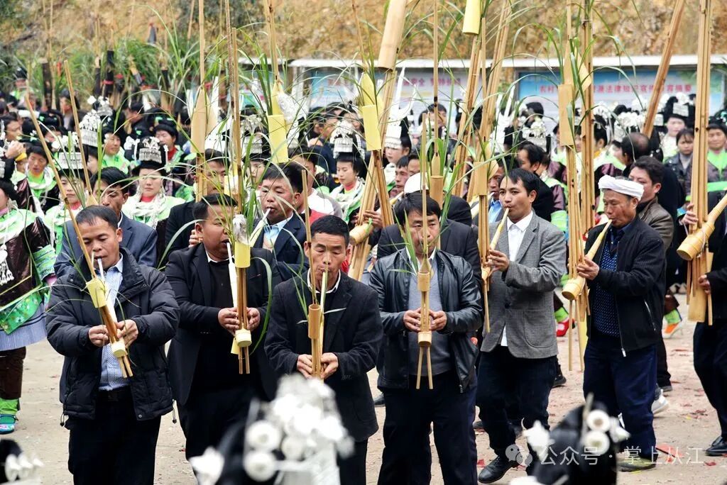2月17日,从江县丙妹镇敖里苗寨迎来一年一度芦笙节,来自贵州省从江县的苗族、壮族群众和广西壮族自治区融水苗族自治县的苗族群众欢聚一堂,通过芦笙踩堂、芦笙比响等形式共庆新春佳节,合奏黔桂两省区民族团结“交响乐”,共话乡村振兴。(从江县融媒体中心记者 吴德军)。